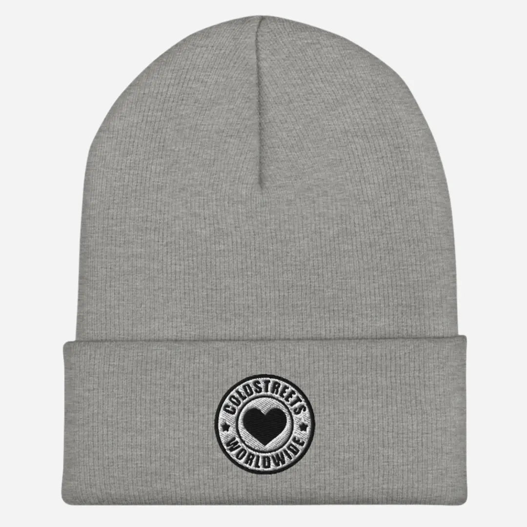 Gray knit beanie with circular black and white heart logo for CS Clothing Co