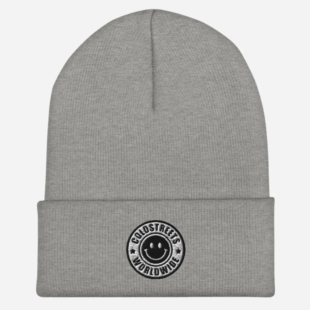 Gray knit beanie with smiley face patch from CS Clothing Co. in Heather Grey White