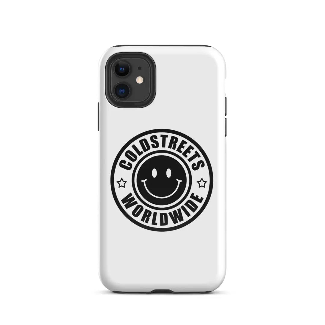 White iPhone case with black smiley logo and COLDSTREETS WORLDWIDE for Pro Max and Mini iPhones