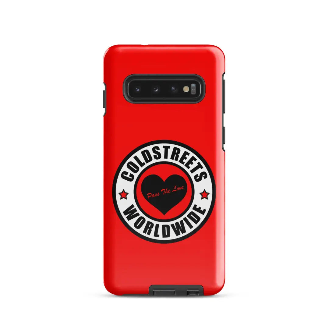 Red phone case for Samsung Galaxy S20, S21, S22 with Coldsteel logo and heart design